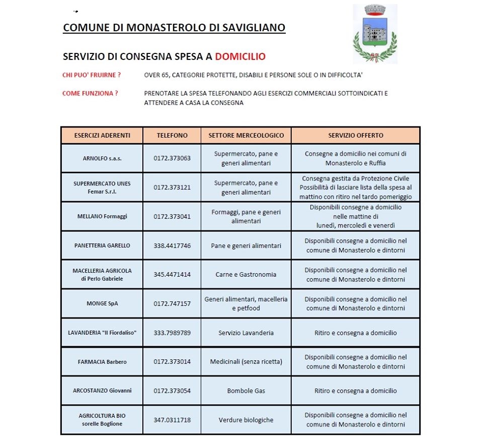 Il Comune di MONASTEROLO DI SAVIGLIANO in un clima di grande collaborazione e solidarietà, ha chiesto la disponibilità ai commercianti locali di attivare un servizio di consegna a domicilio della spesa.